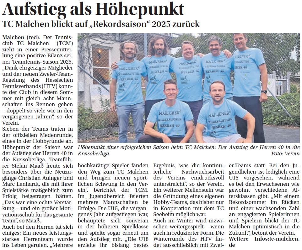 Beitrag aus dem „Bergsträßer“ über den Mannschaftserfolg der Herren Ü40 in der Medenrunde 2021. (Ausgabe KW40/2021)